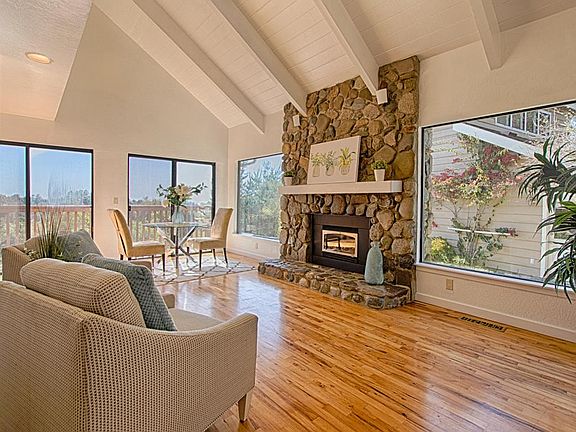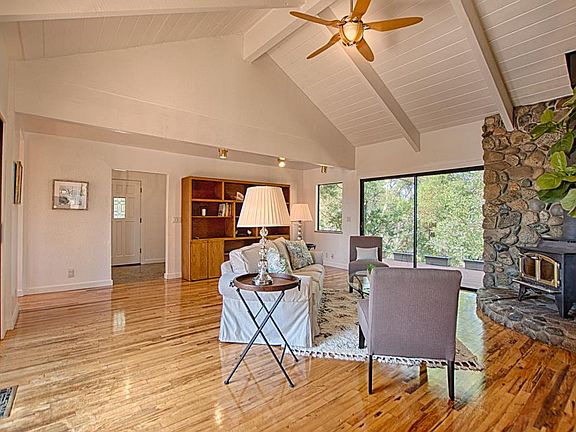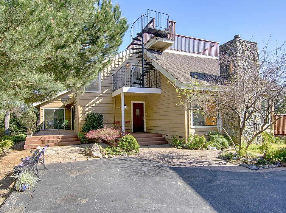 This delightful custom home is situated in a wooded area. It has a country feel but is a quick drive to shopping, dining, freeway, and nearby schools. The high ceilings and many sliding doors to decks give an open, light and bright feeling to this quality home. The living room, kitchen, and family room have pecan flooring. The gourmet kitchen has a built-in cook top and oven, stainless steel appliances, granite counters, island with sink & eating area, and walk-in pantry. There are 2 bedrooms downstairs, a gorgeous granite bath and 2 fireplaces. Upstairs is the master suite with view balcony and walk-in closet.. The luxurious bath has a long granite counter, dual sinks, jetted tub, TV niche, 2 person shower, and more. Enjoy sunsets and distant ocean views from many rooms and deck areas. The bonus/office/art studio over the garage is not included in the home's square footage. Parking and flat areas front and back with terraced hillside complete this gorgeous property.