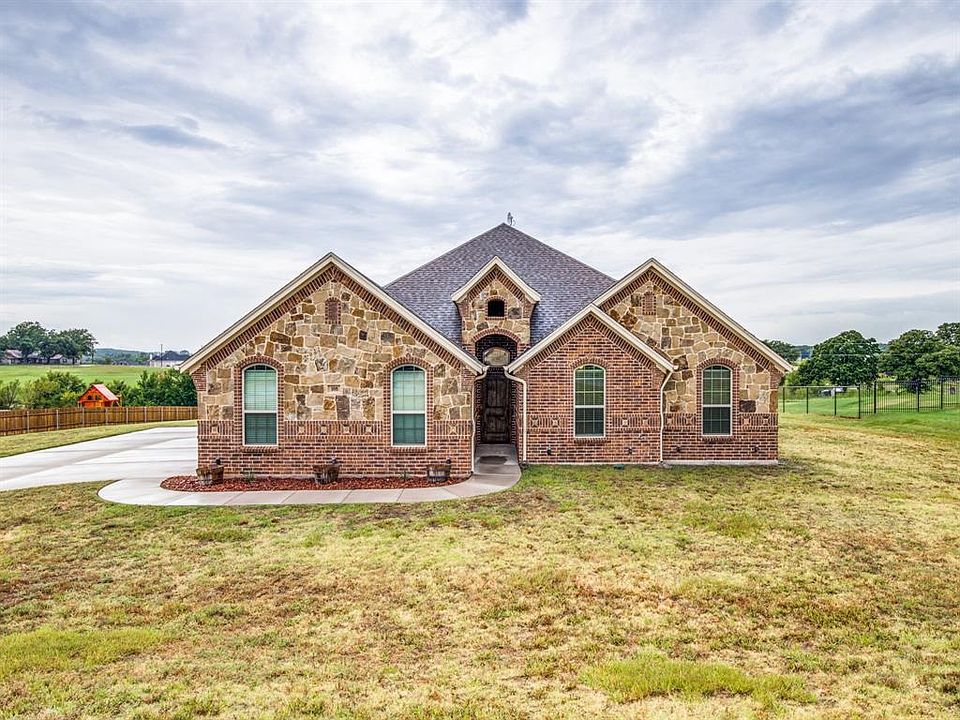 Beautiful single story home on a full acre! Country setting with plenty of space. Home features four bedrooms, two bathrooms, and an open kitchen concept. Large island with bar seating in the kitchen, with granite counters and stainless steel appliances. Coffee bar near living room. Walk in pantry, and real wood cabinets. Living room has a nice stone and brick fireplace with engineered wood floors extending into large master bedroom. Master bath has dual sinks, granite counters, separate bath and updated showers, and large walk in closet. Tons of backyard space, and exterior features covered patio, gutters, and nice views. Up lights in the front of the home. Well cared for home.