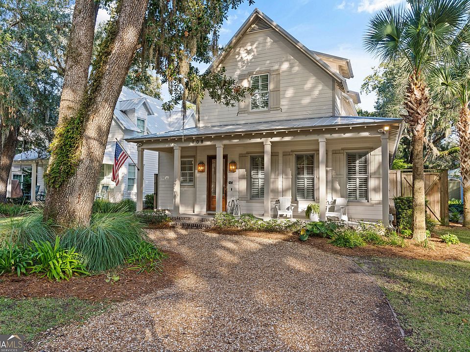 Discover coastal elegance in this Low Country Style beach cottage, blending charm with modern convenience. Perfectly positioned near the beach, shops, and dining, this turn-key gem is ideal for both serene retreats and rental potential. Its captivating curb appeal showcases covered porches and a classic design. Inside, the space radiates warmth with coffered ceilings, oak flooring, shiplap accents, plantation shutters and a sunlit atmosphere. The gourmet kitchen stands out with its large island, spacious cabinetry, and separate cooling units. The primary bedroom on the main level promises relaxation with French doors opening to the backyard oasis, a generous walk-in closet, and deluxe bath. Additionally, find a handy laundry room and two upstairs en suite bedrooms. The backyard is a haven, highlighted by a pool with a spill-over spa, astroturf, and a covered outdoor kitchen, perfect for relaxation or entertaining. The property also offers promising rental potential. Experience this beautiful coastal treasure!