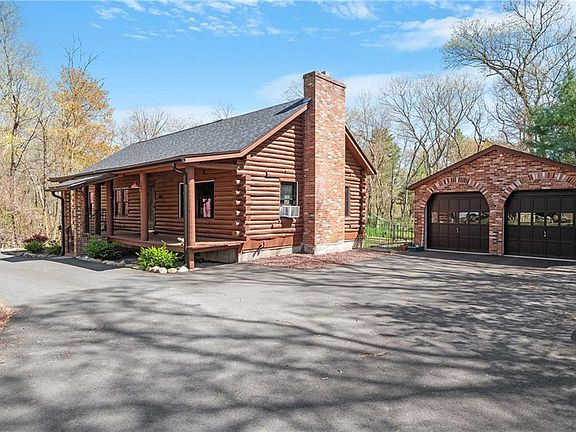 Tucked away in the serene woods of Smithfield, this charming 3 bedroom, 1 bath log cabin offers the perfect blend of rustic character and natural beauty. Set back on just over an acre, this peaceful retreat backs up to more than 42 acres of preservation land, ensuring an ever-present connection to nature. Inside you'll find the warmth and charm you'd expect from a true log cabin - wood beamed ceilings, natural finishes and hard wood floors. The spacious living room with a working fireplace flows seamlessly into a dining area and cozy kitchen blended together openly as the 'heart of the home' that is filled with natural light and views of the surrounding trees. The home also features a detached two car garage with power door openers, offering plenty of space for parking, storage or hobbies. Both the attic and basement offer more finished space for peaceful meditation areas or bonus rooms! The heated 4 season room leading to the back yard has a kitchenette ready for entertaining overflow. Recent upgrades include Pella windows, new driveway, gutters, fully renovated bathroom and more! Whether you are relaxing on the covered front porch, exploring the nearby conservation trails, or simply enjoying the quiet sounds of the woods, this property is a true escape from the everyday. Don't miss your chance to own this little slice of secluded paradise that is still conveniently located about a 10 minute drive to shopping, dining, entertainment, highway access and so much more!