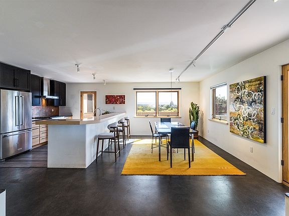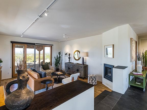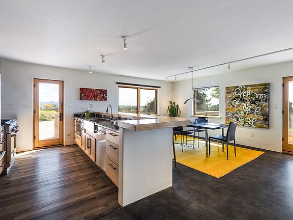 Set on 3 private acres with sweeping views of the Jemez and Sangre de Cristo Mountains, this contemporary home blends style, efficiency, and versatility. The 2-bedroom, 2-bath main house features an updated primary suite, newer kitchen, windows, and cork flooring. Owned solar panels help offset electric bills, adding to the home’s sustainability. Creative and functional spaces expand the possibilities: a detached, 1050 sq ft, artist studio with its own bathroom, a 600 sq. ft. heated and cooled garage with office, a potting shed, and an additional storage shed. Established gardens and cisterns for water catchment support irrigation and year-round enjoyment of the land. With no HOA restrictions and a setting designed for privacy, this property offers freedom, modern comfort, and inspiring Northern New Mexico views — all in one remarkable package.