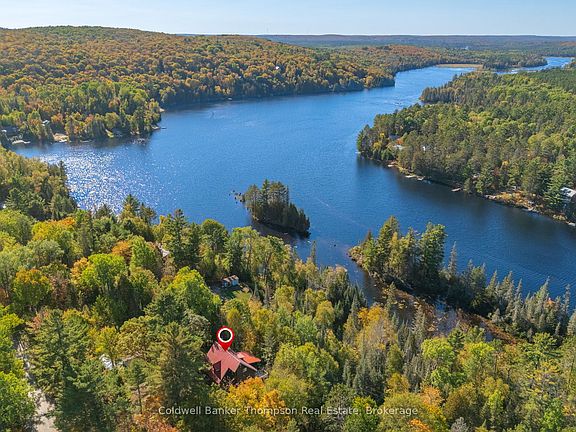 Welcome to this warm and inviting 3-season chalet-style cottage, red pine-finished & tucked among the trees with an elevated view of Forest Lake. Not to mention stunning sunsets provided by western exposure. Surrounded by nature and outdoor adventure, this cozy retreat offers a classic cottage experience with space for family and guests to relax and recharge. With several kilometres of lake and river to explore, plus access to the South River & Algonquin Park - you'll love spending your days boating, canoeing, kayaking, or fishing. Inside, the main floor features an open-concept kitchen and living area, with large windows framing the natural surroundings. The kitchen offers ample space, a breakfast-bar island, and a dining area with views of the lake. The living room is warmed by a woodstove - one of two that serve as the primary heat source (both with updated WETT certifications) and is comfortably furnished (all furniture included; small staging/personal items not included - ask for excluded item list). Also on the main floor are two spacious bedrooms, each with bunk beds and a double bed. One includes a closet, and the other has a closet and in-suite washing machine. A 4-piece bathroom completes this level. The upper-level loft, with high ceilings and generous natural light, is currently used as the primary bedroom with sitting area. The walkout lower level is partially finished and features a Great Room with large windows and access to a screened-in sunroom/covered deck. This level also includes the utility room and a bonus room ready to be customized. A drain pipe for a toilet has been installed in the middle room (labeled storage on the floor plans), offering the potential to complete a second bathroom. Outside, natural meandering pathways wind through the trees to the shoreline, and the upper-level deck offers a lovely vantage point of the lake, nearby island, and surrounding Group of Seven-Style Scenery. EXTRA INFO AVAILABLE - ASK AGENT.