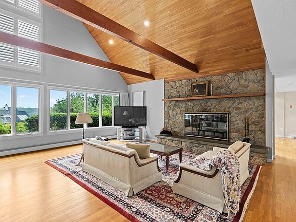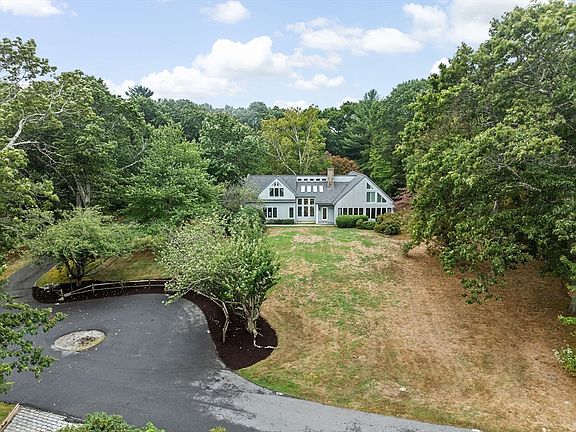 Welcome to Cornwell Hill, a private road in the heart of Marshfield Hills. This stunning contemporary home boasts seasonal distant views of the South River, marshes & Humarock ocean while nestled on a 1.24 acre lot at the end of a cul de sac. Enjoy a beautiful heated gunite pool w/ whirlpool spa embraced by specimen plantings. The home is 3,739 sq. ft. & has a fabulous open floor plan for entertaining. Cathedral oak ceiling in the living room w/ a massive fieldstone fireplace is the pulse of the home. Large windows flank the main rooms to let in the sunshine. Primary suite is on the 1st level with newer bath & laundry facilities. There is a large family room with office/bonus room & access to the basement. Half bath across the hall is for your guests. The kitchen has an eat in area & a solarium for the plant enthusiast. Walls of glass sliders overlook the pool area. Second floor is an open balcony w/ sizeable bedrooms at either end & full bath. Feels like a VT chalet. Eames Way School