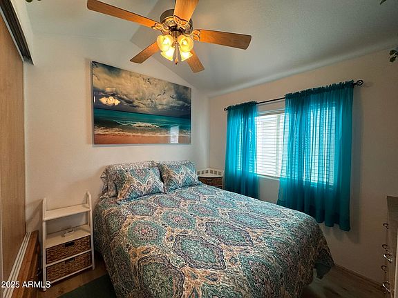 Furnished 2008 Cavco, on sunny side of street! Charming property features fully covered awnings over home & 2-fully concreted lots for low-maint outdoor living. Freshly painted exterior, patio deck w/built-in storage. Inside, find upgrd LVP flooring, vaulted ceilings, & all drywall construction. Home boasts energy-efficient Low-E dbl-paned windows-new 3-front & bathroom windows helping to maintain a comfortable home. All-new 1'' faux wood blinds. Bathrm features convenient walk-in shower. Kitchen well-equip w/newer SS appl, pantry & ample cabinet space. Bedrm features newer mattress, bed has underneath storage. Includes fully finished She-Shed, w/toilet, utility sink, & on-demand water heater—perfect as a guest space or 2nd bedroom, incl W&D & 2nd refrig. Addtl storage shed on extra lot! Living in Caliente Casa de Sol means embracing an active and vibrant lifestyle, with pickleball courts, 4 pools, 4 spas, a clubhouse, woodworking, ceramics, a dog park, shuffleboard, horseshoes, and so much more!