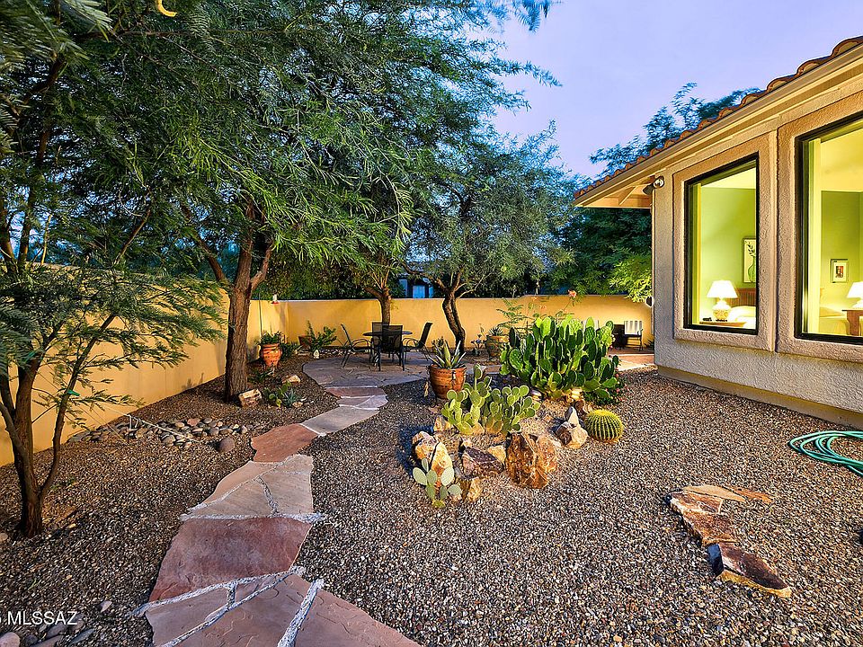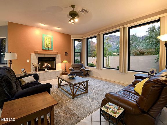 I have been doing this a long,long time and when I say this home is a perfect reflection of the Tucson lifestyle....it is. Enter through the courtyard and you are immediately drawn to inside/outside living. High ceilings, windows at every turn,, open floor plan,and a master tucked away separately. The 4th bedroom is such a perfect office as well. The living and dining room offer a hint of formal living but remember... it is Arizona formal. Means...come on in and relax. My favorite parts? Well it has to be the mountain views,, the serene privacy (abuts a common area ) the myriad of places to sit and enjoy the outside, and all nestled under beautiful mature trees. Sitting in a quiet gated community in the heart of Oro Valley.... well this is a true find.