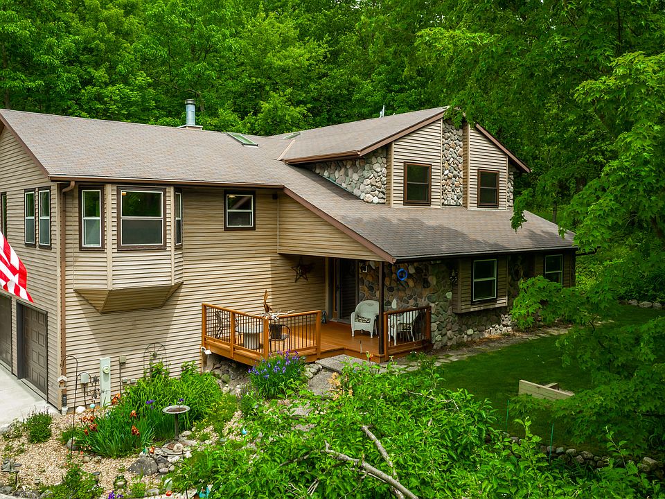 SLINGER SCHOOLS - If you ever wanted the feel of living in a tree house, this is it! Sitting on a 1.6 wooded acre lot within the private neighborhood of Scenic Moraine Parc, this home offers space for everyone. Open concept, tons of windows to take in the wooded scenery, updated kitchen w/custom cabinets & granite counters, updated bathrooms, large family rm with natural f/p (& gas log lighter) & patio doors that lead onto a large deck. The master bd has a private bath w/2 closets (one is a walk in) & there is a lower level family rm with full sizes windows and warm wood ceiling, plus additional room to expand! Oversized heated garage (21x26) plus a large shed (12x16). Access to the neighborhoods PRIVATE LAKE & PARK! This place is like living ''up North'' but without the drive!