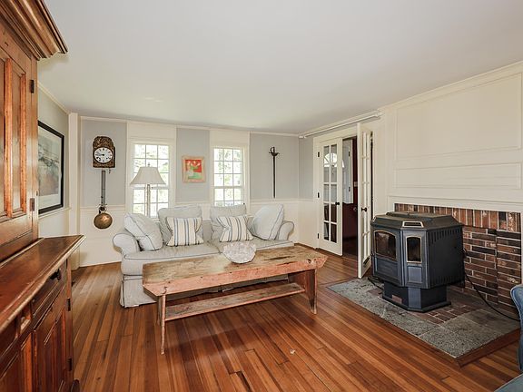 Perched atop 5.39 rolling acres, this timeless turn-of-the-century cape farmhouse offers sweeping mountain views and a serene country setting. With 5 bedrooms and 3 bathrooms, the home blends historic charm with modern comfort, featuring an attached garage and a classic New England-style barn. Step inside to find rich post and beam construction, warm wood tones, and the kind of craftsmanship that evokes the comfort of days gone by. The oversized dining room is open and sunlit, perfectly positioned to capture the beauty of the mountains. A cozy living room welcomes you in and leads to a classic brick-covered porch, ideal for outdoor entertaining or quiet morning coffee. Above the kitchen and garage area, additional living quarters offer flexibility with a 3/4 bath and kitchenette (no stove), making it a perfect space for an artist’s studio, guest accommodations, or multigenerational living. A hand-painted mural in the music room illustrates the home’s own pastoral setting, while the grounds are graced with perennials, peach trees, and peaceful nooks to sit and reflect. A new roof, updated heating system, and whole-house generator ensure comfort and reliability. Your hilltop country oasis awaits—offering history, heart, and the quiet beauty of rural New England.