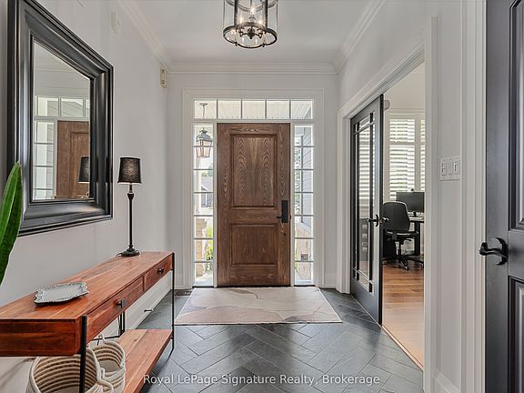 Discover main floor living at its finest in this stunning custom bungalow, perfectly positioned on a quiet, mature cul-de-sac in the coveted community of Lora Bay. This premier lot backs onto mature trees, offering ultimate privacy and a peaceful setting, while being just steps to the beach, clubhouse, and championship golf course.The open-concept main floor is designed for both comfort and entertaining, featuring soaring cathedral ceilings, post-and-beam accents, a natural stone fireplace, and a chefs kitchen with premium appliances and a generous island. A formal dining room, large office/den or bedroom, and spacious mudroom with custom cabinetry add to the thoughtful layout. The primary retreat offers a spa-inspired ensuite and a walk-in closet. The fully finished lower level extends the living space with a large recreation room, gas fireplace, two additional bedrooms, a fitness room, and a luxurious bathroom with a steam/sauna shower. Outside, enjoy summer evenings on the private back patio, surrounded by low-maintenance landscaping and mature trees. Ideally located just minutes from downtown Thornbury's shops and restaurants, with easy access to skiing, trails, and the areas best four-season lifestyle amenities. This rare opportunity combines the best of location, privacy, and luxury living in Lora Bay.
