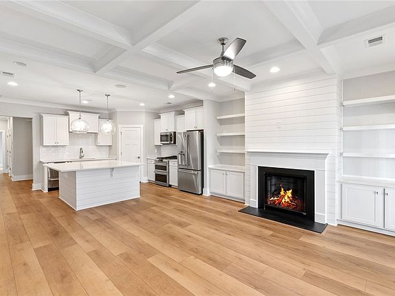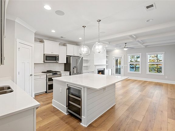 Upon entering the ground floor, a generous bedroom awaits, versatile enough to serve as a flex room with a full bath, wet bar, built-ins featuring bookshelves, and an elegant fireplace. The first level showcases an open kitchen/living room concept, featuring a fireplace, a center island with a wine cooler, quartz countertops, and a complete kitchen appliance package, including top-of-the-line GE Crest appliances. Additionally, a guest bedroom with an en-suite bathroom completes this level, complemented by a screened porch accessible from the living room.