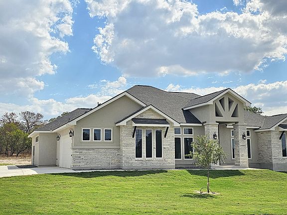 OPEN HOUSE SAT-SUN 11am - 4pm. Beautiful 4BR/3.5BA custom home w/elegant elevation on 1 ac. A high foyer welcomes you next to the study and dining rooms. Inviting kitchen w/quartz, b-splash, & S.S. appliances. Relax in M-BR w/exposed c-beams. M-BA w/soaker tub inside a luxury custom shower w/b-splash, & custom walk-in closet. Add'l upgrades: High ceilings, custom cabinetry, accent lighting, ceilings, front side with stone. Entertain in rear covered patio and enjoy your summers. Enjoy shade under a majestic oak tree in backyard. Near Floresville, Hwy 87, US 181, 1604, and San Antonio. Groceries, eateries, & shopping are nearby.
