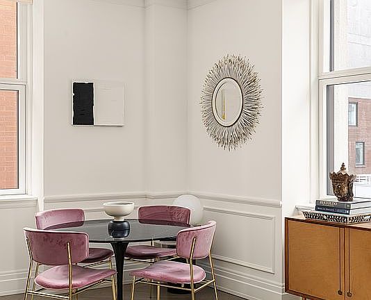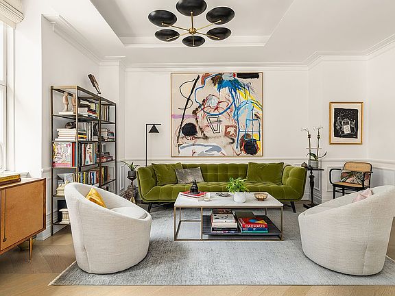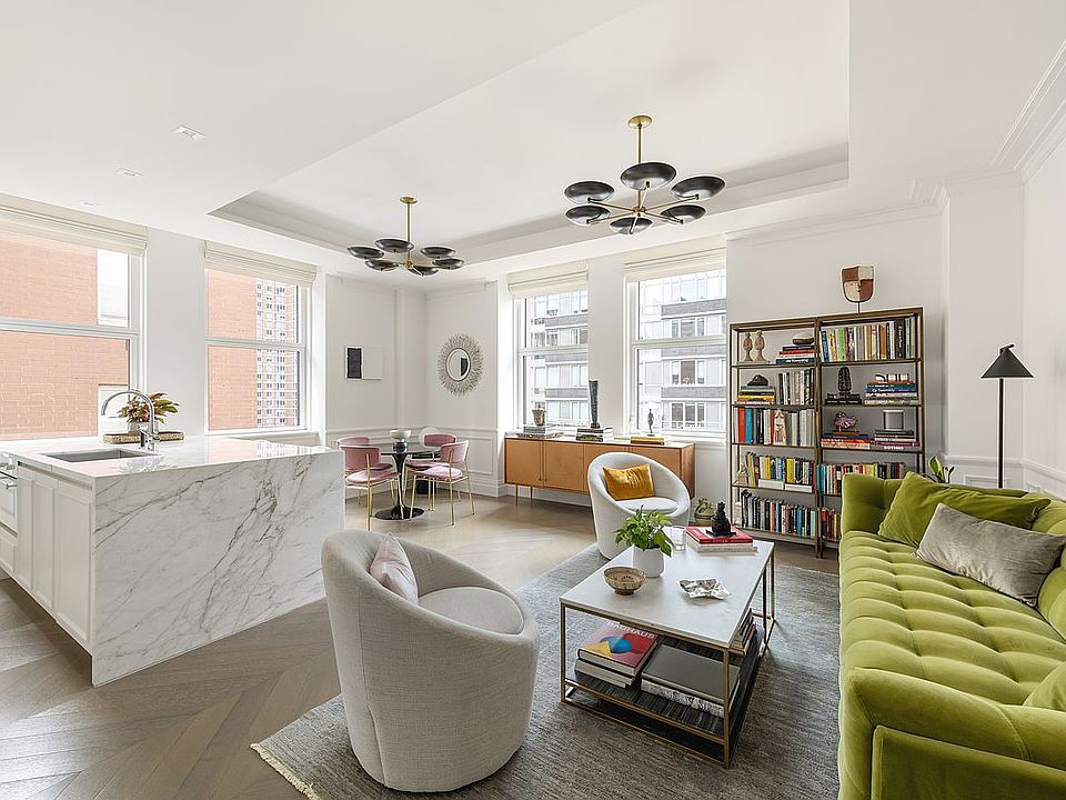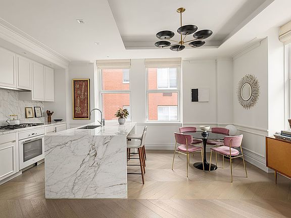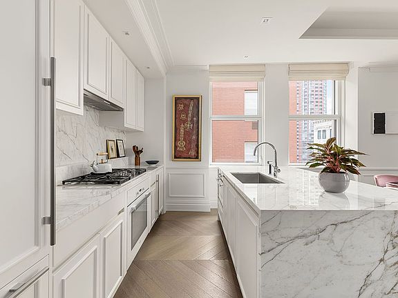 An inviting foyer welcomes you into the sun-filled corner living room overlooking Broadway, a gracious space designed for both entertaining and serene evenings at home. At the heart of the home, the elegant kitchen by Jeffrey Beers International balances function and artistry. Outfitted with Italian Scavolini cabinetry, the open-plan kitchen features an Arabescato Cervaiole marble countertop and backsplash with a beautiful waterfall island. Generously proportioned, the kitchen includes premium Miele appliances such as a five-burner gas cooktop with vented hood, combination steam/convection oven, speed oven, and wine refrigerator. A separate dining area sits adjacent to the kitchen and living room, offering the perfect setting for dinner parties or casual meals alike.