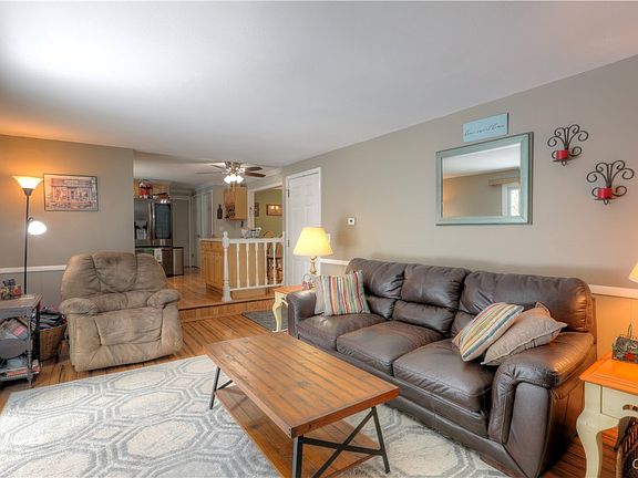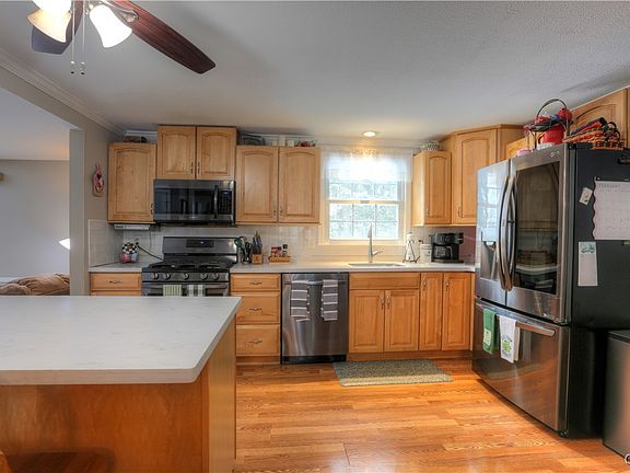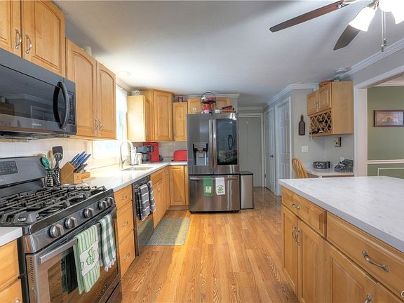 Welcome Home! This beautiful Colonial home has been meticulously maintained by homeowners for over 30 years and now it is time to make it YOURS! Kitchen with NEW solid surface counter tops, stainless steel appliances, decorative backsplash and island breakfast bar. Family room and dining room off the kitchen making it a great space for entertaining! Family room with built ins and a wood burning stove insert brings in a significant amount of heat and it's a highly efficient way to heat a room. Slider off the family room steps out to a deck overlooking a fenced yard. Dining room is elegant with shadow boxes and crown molding. Large living room with hardwood floors is divided off from the main space, creating a separate zone for another TV room, home office or reading nook. Second floor features 4 generously sized bedrooms and closets. Primary bedroom with double closets and a full updated bathroom with a tiled walk in shower. Finished lower level features a small kitchenette with sink, cabinets and refrigerator as well as more living space. Recent updates include counter tops, roof, interior doors, baseboard & crown molding, hot water tank & more! This is the place to call HOME!