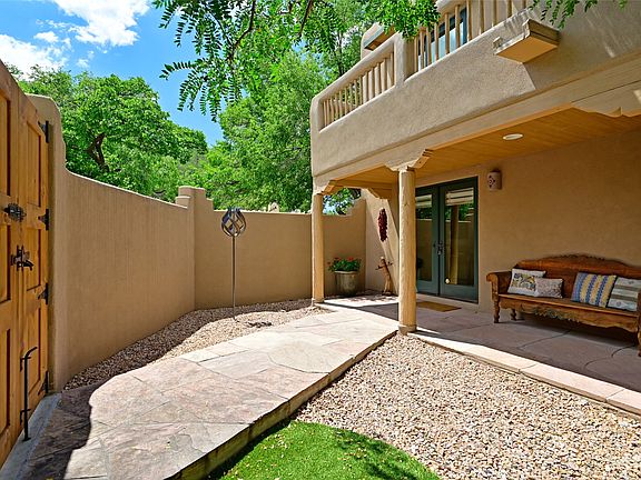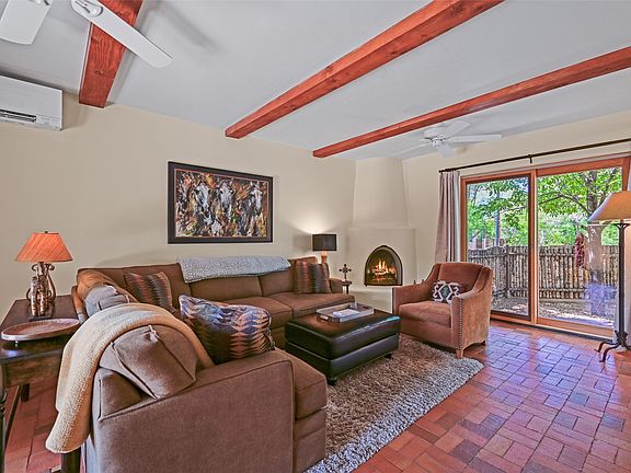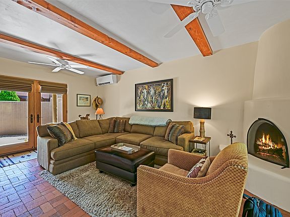 This 2-bedroom, 2.5-bath end unit condo offers approximately 1,374 sq. ft. of inviting living space close to the Plaza, with the Fort Marcy Complex, park, and hiking trails nearby. Inside, classic Santa Fe style shines with warm brick floors, nichos, plastered walls, Spanish tile in the bathrooms, and a cozy kiva fireplace. The sunlit kitchen features stainless steel appliances, silestone counters and an abundance of natural light. Both bedrooms have ensuite baths, and one opens to a deck with morning sun. Updates include 3 mini-splits, enlarged primary closest and bathroom. A private detached one-car garage, gated front and back courtyards for entertaining completes this ideal lock-and-leave home in a prime location.