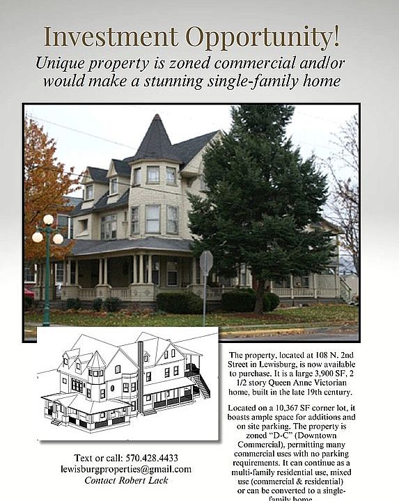 Large, historic Victorian Home, presently (4) unit investment property. Can be converted to a single family home, plus rental income producing Apts or businesses. Large corner lot, ample room for parking, yards, and building expansion. Great dowtown location, walkable to all shops, restaurants, services in Lewisburg. If interested email, lewisburgproperties@gmail.com