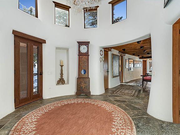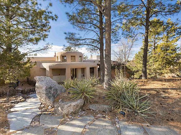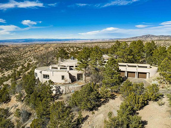 Enormous Views with Timeless Architecture! Built by Taliesin West Architect Charles Johnson, this adobe home has a distinctive Frank Lloyd Wright style. The dramatic circular living room is 30 feet in diameter, with large picture windows showcasing the beyond-belief views of the Jemez Mountains; thousands of acres of Tesuque Pueblo land, and Los Alamos night lights. The 6811 sq ft home has 4 bedrooms and 6 bathrooms. A showcase home, perfect for entertaining. Complete with elegant custom teak cabinetry and doors, Italian travertine, and Rocky Mountain quartz flagstone flooring, a library and office, his and her master baths.The master bedroom has a large shepherd's fireplace with built in teak bookcases. The attached Guest Casita has its' own living room, kitchenette, and 3 bedrooms and 3 bathrooms. The home is single level, with no steps. Just up the hill from the Four Seasons Resort, the property is sited on 5+ acres. Property is secured with two private automatic gates. You will luxuriate in enormous full sky sunrise and sunsets. Relax and entertain with the multiple outdoor entertaining areas and fireplaces. Truly amazing privacy and views, and only 15 minutes to town.