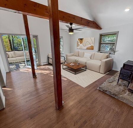 This expanded lakefront log home offers direct lake access and the perfect blend of rustic charm and modern comfort. The cabin has been tastefully remodeled, featuring a brand new roof, new boiler, all new kitchen and bath, and new flooring throughout. The home includes 3 bedrooms and 1 bathroom, providing a cozy and functional layout. Family room opens onto the refinished deck, which features a full lake view and a massive backyard, the perfect spot to sip your morning coffee and watch the seasons change. Inside, two fireplaces create a warm, inviting atmosphere to keep you cozy all winter long. The two-car garage with attic space offers ample storage and potential for additional personal space. The private community pool and clubhouse are just a short walk away. Private wooded trails run through this beautiful community, offering the ideal setting for nature lovers to enjoy scenic walks. Don't miss your chance to own a retreat-like home on an oversized lot in the highly sought-after Shady Lake community! Low Taxes!