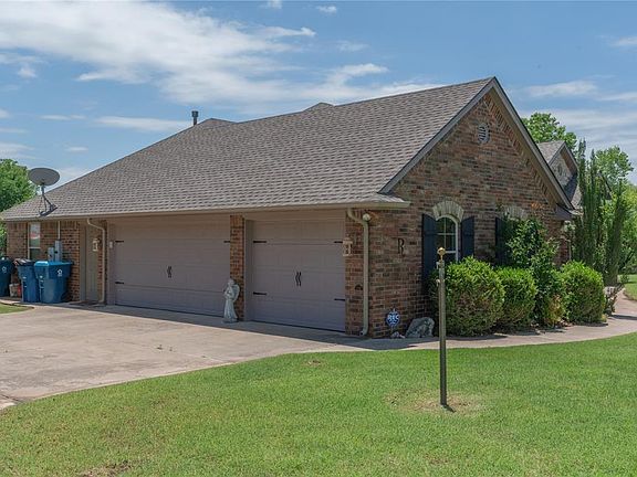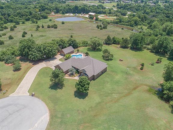 Nestled on a sprawling 1.42-acre lot just off Highway 37 in Tuttle, this exquisite brick and stone home offers an unparalleled living experience. Mature trees and meticulously maintained landscaping greet you, leading to an inviting entryway that opens into a spacious, open-concept living and dining area, highlighted by a corner gas fireplace and custom built-ins. Throughout the home, discover rich stained woodwork and detailed trim, adding a touch of elegance to every room. The oversized chef's dream kitchen is a true highlight, boasting gleaming granite countertops, a stylish travertine tile backsplash, a functional center island for extra storage and workspace, a premium Jenn-Air gas range, and matching built-in double ovens. From your kitchen sink, a large window perfectly frames views of the expansive backyard. Whether it's casual meals in the eat-in kitchen or special occasions in the formal dining room, this home accommodates every culinary desire. The primary suite is a true sanctuary, featuring a charming bay window sitting area, a private entrance to the backyard for seamless indoor-outdoor living, and a luxurious en suite bathroom complete with a jetted soaker tub, spacious walk-in shower, and abundant built-in storage. Step outside to discover an expansive yard designed for ultimate enjoyment. A covered porch sitting area overlooks your fully fenced sparkling pool, complete with a large tanning ledge – perfect for endless summer fun. For added convenience storage and workspace, a detached garage sits just off the patio. This remarkable lot provides ample space for privacy, recreation, or even a dream garden space, and you'll appreciate the peace of mind that comes with a new roof installed in 2024. As an added bonus, neighbors share access to a small pond at the southwest corner of the property, offering a serene escape. Opportunities like this, with recent updates and unique amenities, don't last long, so act fast to make this home yours!