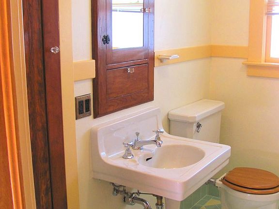 Vintage stoveCustom tile workCustom-tiled bathroomMaple cabinetsHardwood flooringWasher and dryerInside laundry area