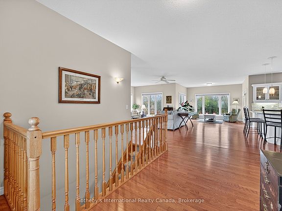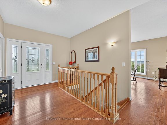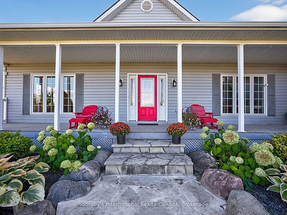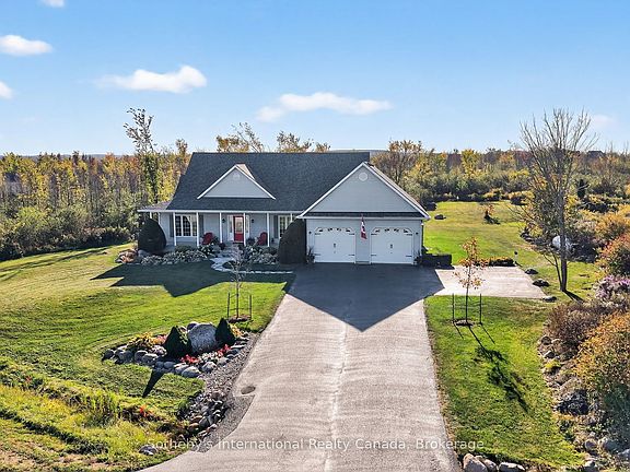 Quality Homes built bungalow on nearly 2 Acres with spectacular escarpment views! Located on a quiet cul-de-sac of executive homes, this exceptional property offers stunning panoramic views of the escarpment and Beaver Valley, and breathtaking sunrises and sunsets. Set on just under 2 acres, this beautifully maintained bungalow combines quality craftsmanship with modern updates and a thoughtful layout.The open-concept main level features 9' ceilings, oak hardwood floors, and an inviting living space centered around a cozy gas fireplace with a sunroom area and formal dining room. The updated kitchen (2021) boasts quartz countertops, custom cabinetry, a breakfast island, and a walk-in pantry. A sunroom and the primary bedroom both provide access to the pergola-covered deck-perfect for relaxing and taking in the views. The primary suite offers a walk-in closet and 4-piece ensuite, while two additional bedrooms (one currently used as an office), a 4-piece guest bath, and a convenient main-level laundry room with garage access complete this floor.The fully finished lower level is ideal for entertaining, featuring a spacious recreation room, games area, a "man cave" with a custom hemlock bar, sauna, 3-piece bath, and abundant storage. There is also direct access to the oversized two-car garage, which offers ceiling height suitable for a car lift.Located just minutes from downtown Thornbury and a short drive to Beaver Valley Ski Club, this home provides the perfect balance of country living and modern convenience-ideal as a full-time residence or weekend retreat.
