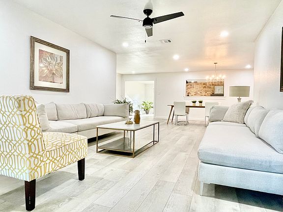 Step inside to an open-concept living area featuring comfortable designer furnishings, smart TV, and stylish decor. The updated kitchen includes stainless-steel appliances, and bar seating that flows effortlessly into the dining and living spaces perfect for entertaining or relaxing after a long day.