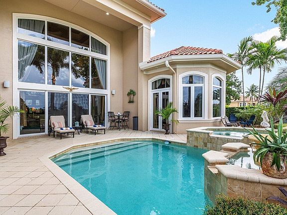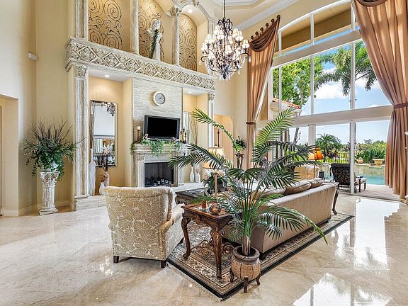 Overlooking the Tesoro River Preserve, this 2-story Custom Creation with 4 bedrooms, 4 en-suite baths, and 2 half-baths features distinctive scenic views of Water, Wildlife, Golf, and a park with moss-draped oak trees. This Spanish Revival home is a breathtaking sight, featuring soaring arched windows and entry foyer, carved wood and stone accents, 24-inch marble floors, natural stone, and abundant molding. Other distinctive details include all luxury brand appliances, a decorative Gas Fireplace, a 2nd-floor media room/Den, upstairs and downstairs laundry, a 3-zone AC system, a Whole-Home Audio System, Instant-on Hot Water, an AC Garage, a 1st-floor wet bar, and a 2nd-level breakfast bar. Enjoy the Beauty of the mature landscaping from the 2 screened-in loggias & a Heated Pool with Spa.