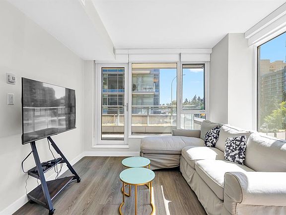 Corner unitOpen-concept layoutLarge windowsNatural lightModern kitchenSleek cabinetryStone countertops