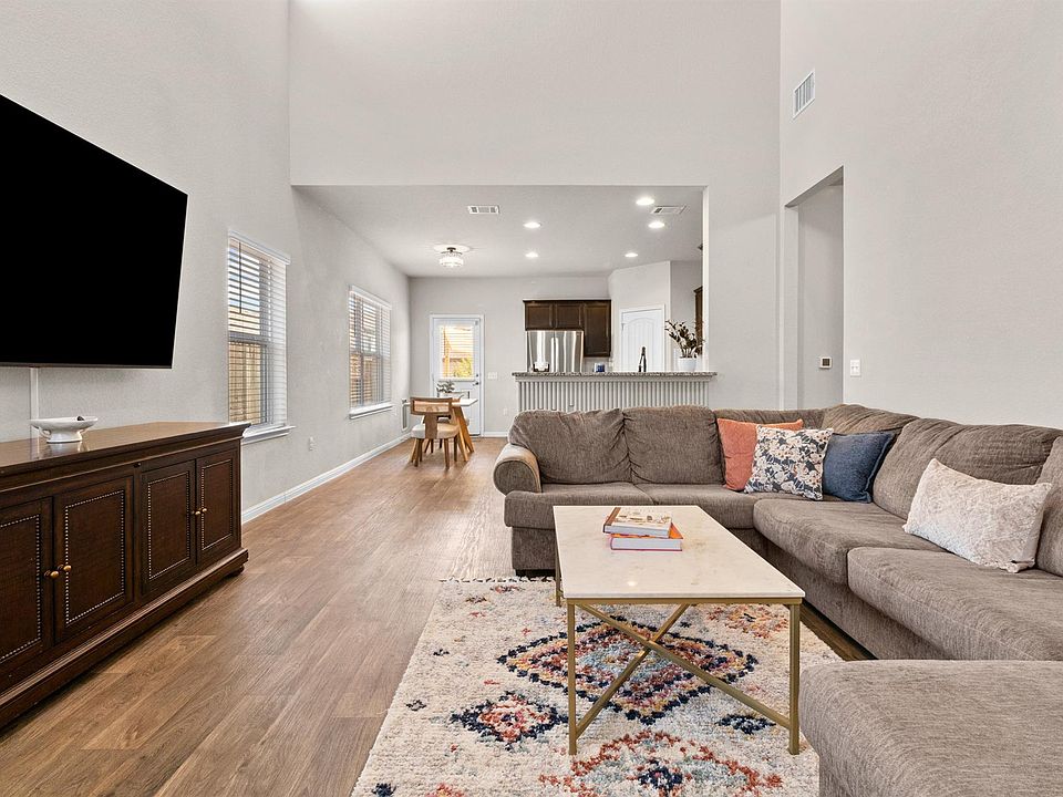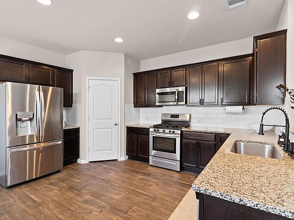Welcome to 108 Sandhill Piper Street, a stunning two-story stone-veneer home perfectly situated on a quiet cul-de-sac within the highly sought-after Leander ISD. Step inside and you’ll be greeted by soaring ceilings, abundant natural light, and fresh, modern finishes throughout. The main living areas feature luxury vinyl plank flooring, while the bedrooms, stairs, and loft are comfortably carpeted. The open-concept layout on the first floor offers an inviting flow between the living area, dining space, and kitchen—perfect for everyday living and entertaining. The kitchen boasts granite countertops, generous cabinet storage, extensive counter space, and a large pantry. The spacious primary suite is located downstairs and includes a walk-in shower, a sizable walk-in closet, and a private en suite bathroom. A convenient half bath and laundry room complete the main level. Upstairs, you’ll find a versatile loft area, two roomy bedrooms, and a full bathroom. Enjoy the outdoors in your private, spacious patio area—ideal for relaxing evenings or hosting guests. Located in the desirable Larkspur community, residents enjoy access to exceptional amenities including two swimming pools, a splash pad, multiple playgrounds, an amenity center with a gym and event space, and scenic hike-and-bike trails. This home truly offers the perfect blend of comfort, convenience, and community living.