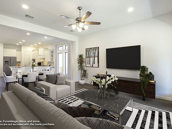 Welcoming entry framed by home office with French door entry. Island kitchen features a built-in seating space, 5-burner gas cooktop and a large walk-in pantry. Family room with three large windows extends to the dining area. Private primary suite with three large windows. Primary bathroom offers a French door entry, dual vanities, large glass enclosed shower and a large walk-in closet. Secondary bedroom offers a walk-in closet and a full bathroom. Second floor hosts additional bathrooms, a Hollywood bathroom and a large game room. Utility room. Covered backyard patio. Two-car garage. Representative Images. Features and specifications may vary by community.