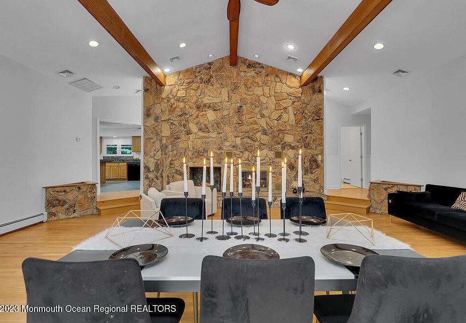 Here is your chance to feel like your on vacation all year long. Located in the highly sought after North Dover area of Toms River, on over an acre of property this custom built, oversized ranch is sure to impress. Step into a 2 story foyer with a gorgeous exterior stone wall and sky lights. A grand room, serving as a dining/living room, boasts the same 2 story exterior stone wall fire place with skylights, many windows and a sliding door leading to the back deck. The eat in kitchen features a double oven, center island and skylight. It's efficiently designed with ample storage and counter space. The laundry room is situated just off the kitchen with a side door exit. An additional multi-purpose room is located off the kitchen with a sliding door that leads to the oversized back deck The 3 large bedrooms and main bathroom are all located off a hallway to the left of the entrance. The primary bedrooms has its own large bathroom and walk in closet. The basement offers a large open area and 2 additional room, along with access to the backyard. Rest assured.... in the quiet seclusion of a beautiful treed backyard. Move in before school begins.