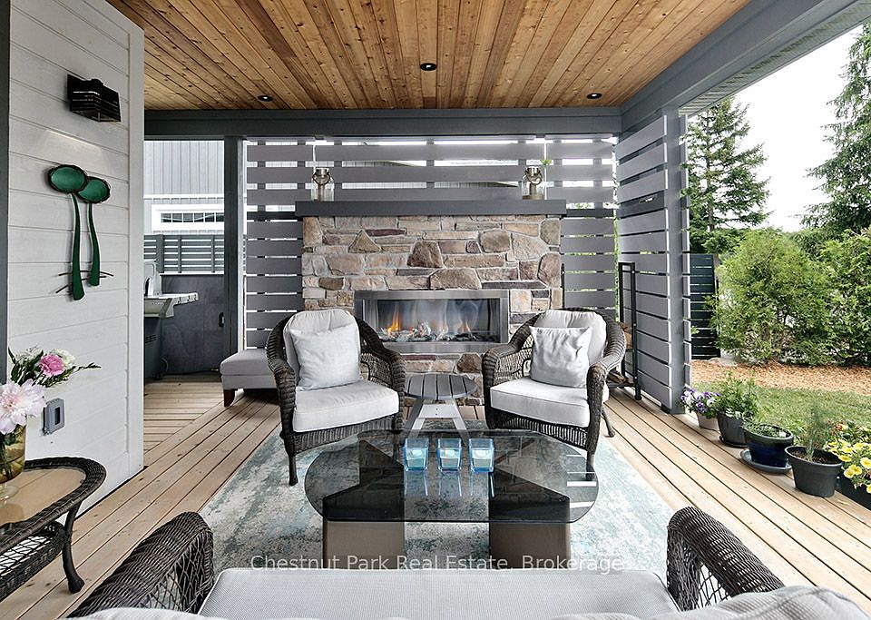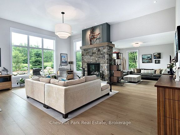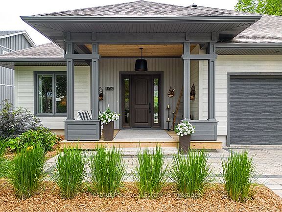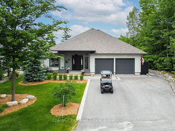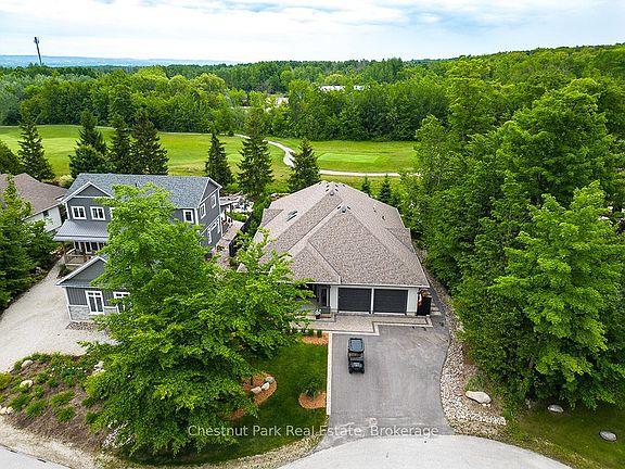 Welcome to 108 Stuart Court in the prestigious Lora Bay community, just west of Thornbury, Ontario. This exceptional, architecturally inspired 2,730 sq ft bungalow is located at the end of a quiet cul-de-sac on the sought-after east side of Lora Bay--known for its mature landscapes, Georgian Trail access, and proximity to the clubhouse. Backing onto the second tee of the Lora Bay Golf Course, this south-facing home offers peace, privacy, and expansive views. Meticulously designed with inspiration from Frank Lloyd Wright and Mid-Century Modern architects, the home blends contemporary styling with warm, natural materials. Interior features include radiant in-floor heating throughout, zoned climate control, and a thoughtful semi-open layout that provides flow and function. The Great Room boasts 12' ceilings, a striking gas fireplace, and direct access to a 330 sq ft covered porch with its own fireplace and BBQ station. The kitchen is thoughtfully designed with custom cabinetry, a 14' island, walnut eating bar, high-end appliances, and walk-out to the rear yard. The private Primary Suite includes a spa-like ensuite with steam shower, soaking tub, dual vanities, and a custom walk-in dressing room. A guest bedroom with ensuite access, a flexible study/third bedroom, and a beautifully appointed powder room complete the bedroom wing. A fully outfitted gear room leads to a finished, heated 630 sq ft garage with storage lift, loft, A/C, skylights, and workshop potential. Built with a focus on energy efficiency and quality, construction includes Zip sheathing, Rockwool insulation, solid core doors, and a radiant slab foundation. No detail has been overlooked--age-in-place design elements, curbless showers, wide doorways, and level transitions throughout ensure long-term comfort. Professionally landscaped, evergreens, and a tranquil water feature, this is a rare offering in a fully built-out section of Lora Bay. Move in and enjoy a true four-season lifestyle.
