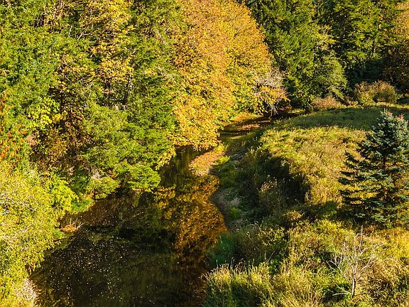 - Features: Paved, Secluded, Brush, Garden/Fruit Trees, Lightly Treed, Partially Cleared, Stream/Creek