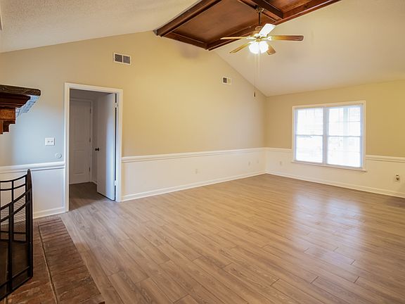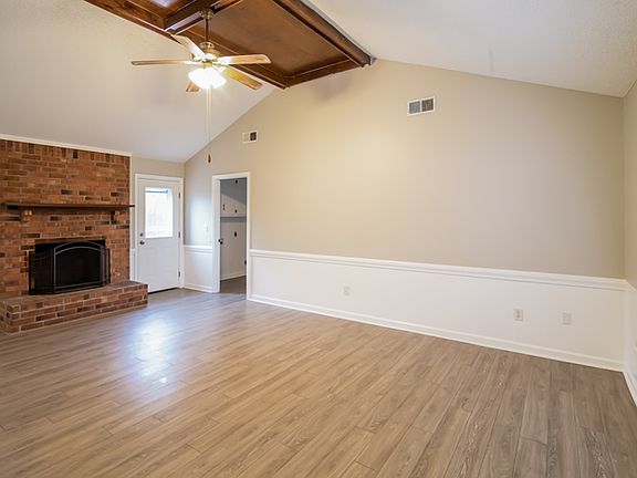 Step inside to find freshly painted interiors and a bright, open layout. The living room features LVP flooring, wainscoting detail, vaulted ceilings, and a brick accent wall, adding texture and warmth to the space. The dining area and kitchen flow together seamlessly, with new LVP flooring, dark wood cabinets, and sleek black appliances surrounded by a crisp tile backsplash, a space that's as functional as it is inviting.