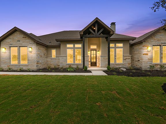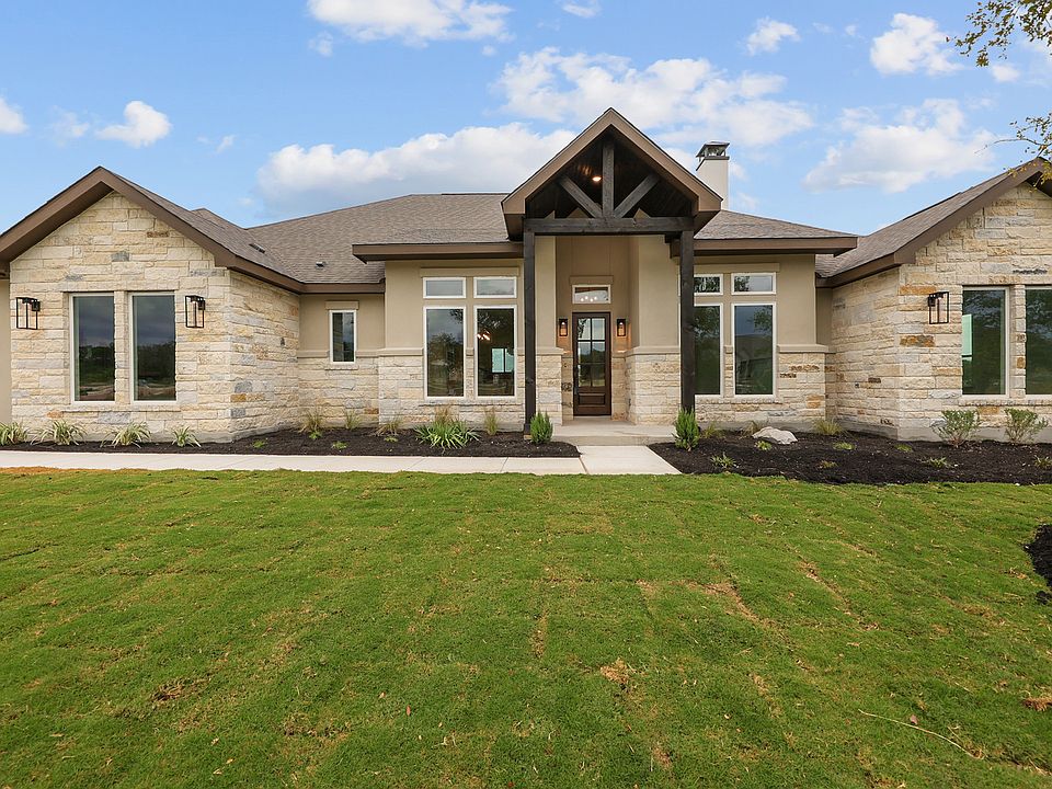 Nestled on one acre and steps from scenic walking trails, this brand-new 4-bedroom, 3.5-bath custom home blends modern luxury with the peaceful charm of the Spicewood Trails community. A refined 2,676 sq ft floor plan by JLP Builders, designed for effortless everyday living and elevated entertaining. The heart of the home is the open-concept great room, showcasing architectural beams, a dramatic cast-stone fireplace, and expansive windows that capture natural light and surrounding hill country views. The gourmet kitchen is a true showpiece, featuring quartz countertops, GE Cafe stainless steel appliances, double ovens, a large island, and a walk-in pantry. The private primary suite offers spa-like serenity with a soaking tub, walk-through shower, and generous closet space. A dedicated guest suite and two additional bedrooms provide flexible living options for family, visitors, or a home office. Step outside to the covered patio with tongue and groove ceilings-already pre-plumbed for a future outdoor kitchen-and enjoy peaceful evenings under the Texas sky. From the cedar truss front entry to every thoughtfully selected finish, this home delivers high-end design with lasting craftsmanship. This new construction home also includes a builder-backed, new home warranty.
