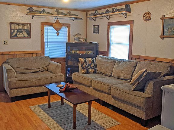 With Tawas Lake access directly across the quiet neighborhood street, this property features a charming remodeled house, a large garage with a finished upstairs, and a separate lot with lake access that can be held for privacy, sold or developed. Three total lots provide abundant outside space. Operated as a short term rental for over 20 years, gross income averaged over $23k annually during 2021 – 2024 tax years. The house could also be a perfect lake cottage/residence or a long-term rental. Wrap around windows in the back dining/living room frame a quiet scene of large oak trees over a deck and the undeveloped lot. The room features a hearth with a masonry chimney if a fireplace is desired. The kitchen and bathroom have oak cabinets and all the essentials for a turn-key rental or residence. An office with a hardwood desk is in a central living room along with other furniture. The insulated front porch has a partial view of Tawas Lake. Lake access here is easier than much of the shoreline since it’s situated near the deeper less weedy parts of the lake. Enjoy premier fishing, hunting or wildlife watching. The large garage offers abundant storage on the first floor for vehicles or recreational supplies. Finished and insulated, the garage second story would make a great workshop or additional space for your needs. The completely furnished (if desired) house is move-in ready including furniture, linens, cooking essentials, and decorative items. Owner will assist in facilitating vacation rental business permitting through the City of East Tawas with necessary drawings and other information. The historic city of East Tawas and Lake Huron is only a mile away. Paved and quiet neighborhood streets are perfect for bike rides all along the Tawas Lake shoreline. Long popular with tourists, the Tawas area has a hospital, shopping centers, Tawas Point State Park, and a downtown city park with a huge dock.