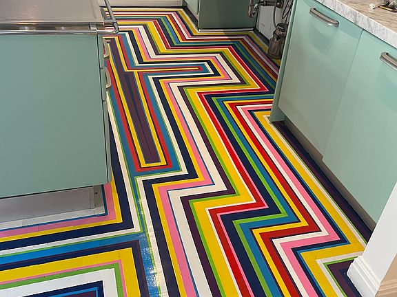 The open, eat in kitchen is one of a kind with contemporary take art done by Artist Jim Lambie.