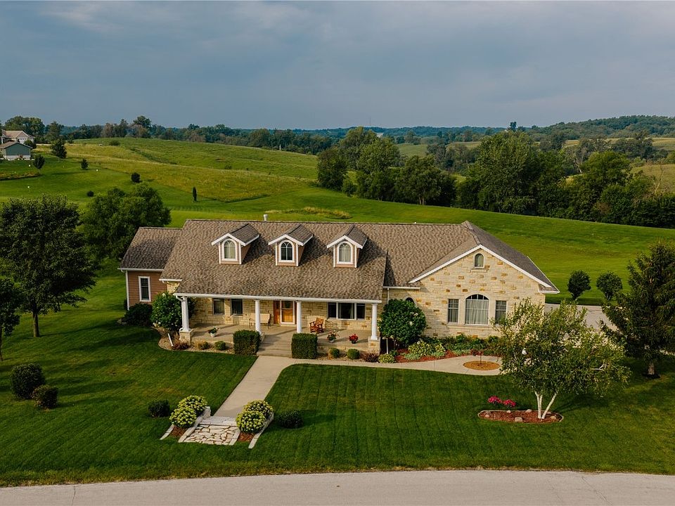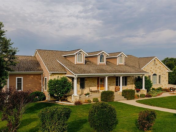 Set on a full acre with peaceful countryside and sunset views, this 4-BR custom-built home is designed to be enjoyed inside and out. The curb appeal is undeniable, with extensive stonework, a grand welcoming front porch, and a brand-new composite deck with glass railing to take in the views without obstruction. Inside, you’ll find spacious rooms filled with natural light, solid-core doors, hardwood floors, and elevated ceilings that make the home feel open and airy. The kitchen is generously sized, offering plenty of space for cooking, gathering, and entertaining. A formal dining room and easy flow between living areas make it perfect for everyday living and special occasions alike. The primary suite features a jetted tub framed by windows and a walk-through closet you’ll fall in love with. The finished walk-out lower level adds even more living space with two additional bedrooms, a bath plus a tiled recreation/game room and a handy wet bar—ideal for hosting friends and family. Comfort meets convenience with geothermal heating and cooling, radiant heated basement floors, a whole-house water softener, and reverse osmosis drinking water. The 3-car garage is a dream, complete with a utility sink, two floor drains, custom storage, and even a secondary entrance to the lower level. Plus there’s a rare 4th stall garage with lower-level entry. This special home offers the perfect blend of thoughtful design, modern features, and warm spaces to make lasting memories. Come see for yourself—you’ll feel right at home!