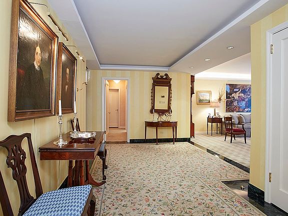 The oversized eat-in-kitchen/dining room, the third bedroom and staff room each face north into a quiet, sun-filled private courtyard with a view onto a beaux-arts mansion. The windowed kitchen, outfitted with the best Miele appliances, is adjacent to a staff room that is equipped with a full bath and washer/dryer. Ample closet/storage space and built-ins exist throughout the apartment. Four full bathrooms include a powder room off the entrance gallery.