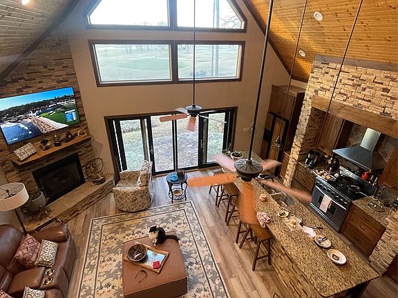 Experience the ultimate resort lifestyle in this stunning 3-bedroom, 3-bathroom A-frame home, perfectly situated directly behind the #3 green at the prestigious Sulphur Springs Country Club. This unique residence offers unparalleled views of the manicured fairways and the tranquil lake, with a west-facing orientation that guarantees breathtaking sunsets every evening. Having been cherished by the same family for 30 years, the home has been thoughtfully updated to blend modern luxury with timeless comfort. The heart of the home is the gourmet kitchen, which features soaring cathedral ceilings, high-end KitchenAid appliances, and custom real wood cabinetry that extends throughout the entire house.