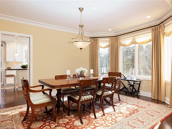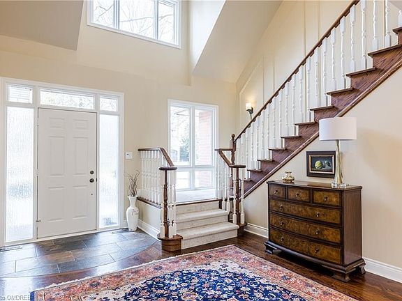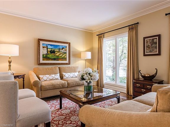 Situated on a prestigious crescent in desirable Eastlake, you'll find this outstanding custom built home designed by renowned architects Gabor + Popper. Over 5000 sqft of living space, filled with natural light, this family friendly floor plan features 4 spacious bedrooms, 3.5 bathrooms & finished lower level. A grand foyer with soaring 17 feet ceilings opens to above. An open concept Kitchen/Breakfast/Family Room with large windows & wood burning fireplace is the hub of this comfortable home, perfect for everyday family living. The separate living & dining rooms offer generous space for formal style entertaining. A private office is an ideal work at home space and has picturesque sight-lines to the outside. The main floor laundry offers access to the oversized double car garage with abundant storage. A large principal bedroom overlooks a lush & private backyard & has two large walk in closets. Relax & enjoy a spa-like experience in updated ensuite with spacious shower, separate water closet, free standing air jet tub, heated floor & towel bar. 3 additional bedrooms & updated 4 piece bath complete this level. Oversized windows in the lower level offer an abundance of natural light making this the perfect setting for family fun in the billiards, exercise & recreation rooms. There is also a 3 piece bath, climate controlled 304 bottle wine cellar & extensive storage. Glass doors from the kitchen lead outside to a beautifully treed & private yard designed by Juergen Partridge Landscaping. It includes a multi tiered deck & patio, manicured gardens & extensive plantings. The front landscaping & parking pad to accommodate 6 cars was designed by Intriguing Landscapes. Numerous upgrades including gleaming hardwood floors, fresh neutral décor, new carpeting in the bedrooms, hallway & stairs & both irrigation & security systems. Excellent value in one of Oakville's finest school districts with easy access to downtown boutiques and restaurants, highways, GO train & the lake.