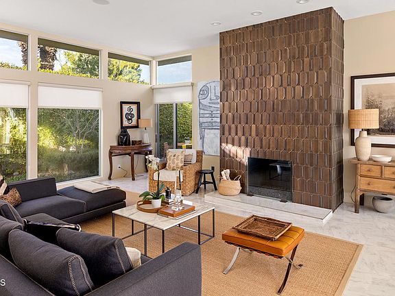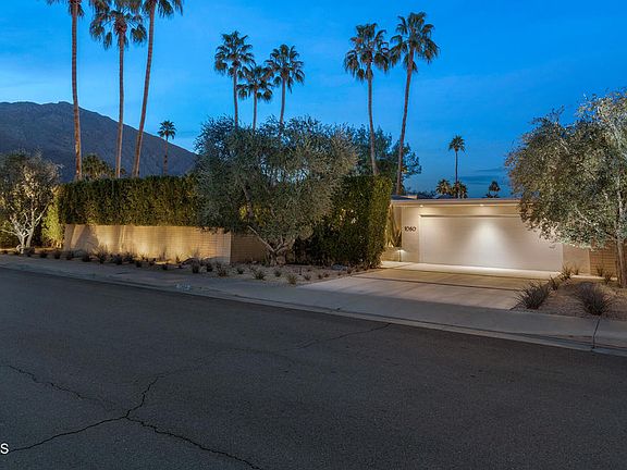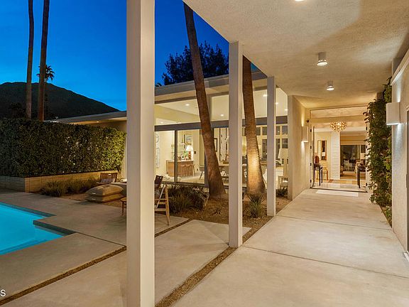 A unique departure from the ordinary. Discretely hidden behind mature hedges you'll find all the hallmarks of the Palm Springs modernist movement in Indian Canyons. Mid-Century notes have been expanded, made more grand. Every space is just a bit better, larger and sweeter. Custom double gates welcome you to a soaring 48' colonnade reminiscent of the beloved entry at the Spa Resort and Casino. Warm, sophisticated interiors and gracious layout of this nearly 3700 sq ft showplace are on full display in the grand public spaces, offering voluminous 14' ceilings with floor to ceiling windows framing the San Jacinto mountain views. This quintessential living and dining wing puts entertainment front and center and includes a fashionable wet-bar with direct outdoor access to the gorgeous pool, spa and multiple outdoor lounging vignettes accented with olive, citrus and palm trees. The primary suite occupies the entire west end of the house and provides complete privacy from visiting guests. The skylit primary bath offers a sybaritic experience including Kohler bath and shower systems, as well as a wood lined dressing room with custom cabinetry. A private patio off the primary suite offers an outdoor shower leading to the pool. The central node includes a bright, gourmet kitchen with custom teak cabinetry, Bosch appliances, waterfall edged bar and adjacent dining area for luxurious entertaining. A warm den, offering a more intimate space for reading or media. Secluded dining patio off the kitchen encourages more relaxation with an outdoor built-in bbq and bar amongst mediterranean inspired landscapes. The east wing is dedicated to guests, featuring 2 ensuite bedrooms and a 4th large bedroom currently used as a sunny, poolside media room.In addition, a spacious laundry room with storage, large 2 car garage with built-ins. Updated plumbing & electrical, as well as dual HVAC systems.