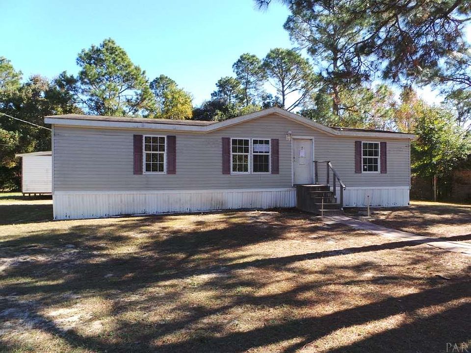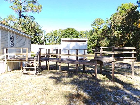Pensacola Mobile Home! Home offers Three Bedrooms Two Full Bathrooms and over 1200sqft of functional floor plan. Interior features some vaulted ceilings, eat-in kitchen with dining area AND breakfast bar. Master Bedroom has vaulted ceilings and Bath boasts a double vanity, garden tub, separate shower and walk-in closet. There is additional storage with a yard building out back AND a large open deck for entertaining.