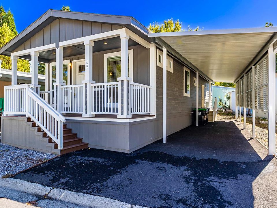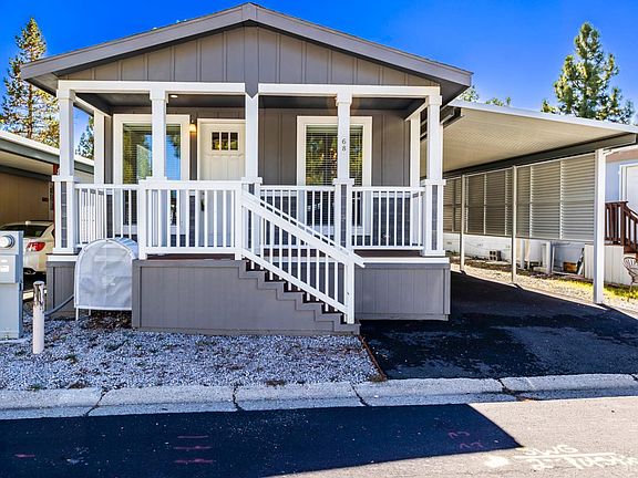 New 2 bedroom 2 bath manufactured home located in South Lake Tahoe. Inviting covered front porch. High ceilings with oversized windows. Open concept kitchen, living room and dining room. Stainless Steel appliances and a big center Island. Solid surface countertops. Recessed lights. Laminate and carpet flooring. Ceiling fans in the living room and Primary bedroom. Primary bathroom has 2 sinks and a large shower. Primary bedroom has large double closets. Separate laundry room. There's room for a shed to keep all your seasonal items. Space rent is $820 a month plus utilities. Some of the parks amenities include, pool, sauna, park, clubhouse, additional guest parking. Excellent in town location close to all Tahoe has to offer.This unit features a virtual staging effect.