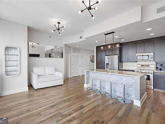 Right in the heart of Midtown, this stunning 2BR/2BA condo offers breathtaking skyline views and a limited-time incentive-seller will pay 6 months of HOA fees or 1% buy down rate with a Full offer by December 15, 2025! Furniture and decor can stay and is negotiable. Floor-to-ceiling windows flood the space with natural light. The open layout flows seamlessly through the living, dining, and kitchen areas-perfect for entertaining. Features include updated flooring, granite countertops, stainless steel appliances, a private balcony and built-in stereo system throughout. The split-bedroom plan provides privacy, with large walk-in custom closets and built-ins offering plenty of storage. Enjoy resort-style amenities: 24-hour concierge, heated saltwater pool, sky park, gym, club room, and outdoor grills and dining area. Just steps away from Piedmont Park, the BeltLine, Fox Theatre, High Museum, and some of Midtown's top dining. Two assigned parking spaces included!