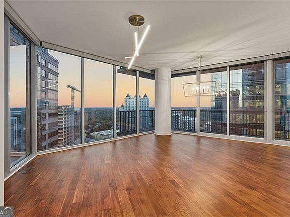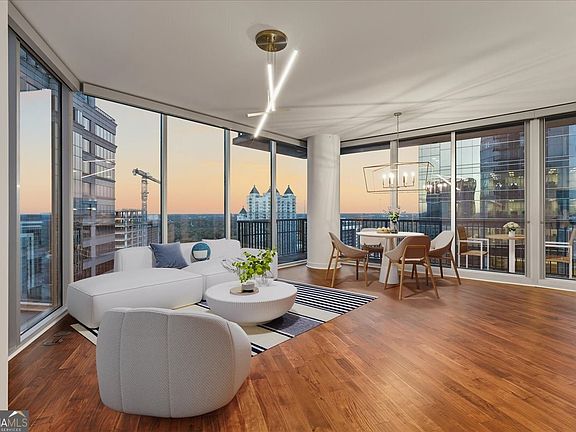Live above it all in one of Midtown's most coveted floorplans - the iconic "03" stack of 1010 Midtown, one of Atlanta's premier condo buildings. Perched on the 26th floor, this corner residence showcases two walls of floor-to-ceiling glass that flood the living area with natural daylight and offer a dazzling backdrop of city lights at night. A dramatic wraparound balcony provides two viewing angles of the breathtaking skyline-perfect for morning coffee or winding down at sunset. Step inside to soaring 10' ceilings and a freshly updated interior featuring new engineered wood flooring (Santa Fe Toffee), 17x17 ceramic tile in all bath floors, shower walls, and tub surround, new 2x2 ceramic tile shower floors, and frameless glass showers for a sleek, modern finish. Fresh paint, elegant designer lighting in the living area, and ceiling fans in both bedrooms elevate the home's comfort and style. The split 2 bedroom, 2.5 bath layout offers privacy, enhanced by custom closet systems throughout. Enjoy easy living with Crestron automated shades on every glass wall-including blackout shades in the primary bedroom-and an internet-connected monitor screen in the primary bath. The kitchen is equipped with a Bosch dishwasher and oven, plus a Samsung refrigerator and stackable washer/dryer that convey with the property. A new HVAC (2023) provides year-round peace of mind, and two assigned parking spaces on the 5th floor add everyday convenience. Enjoy world-class amenities-the SkyDeck's salt-water heated pool, private seating areas, and gorgeous seasonal greenery; a state-of-the-art fitness center with Pelotons, a stylish clubroom for hosting a resident community book club; and 24/7 concierge service-all within steps of the Atlanta Beltline, Piedmont Park, the High Museum, Fox Theatre, Whole Foods, Publix, and Midtown's top dining and nightlife.