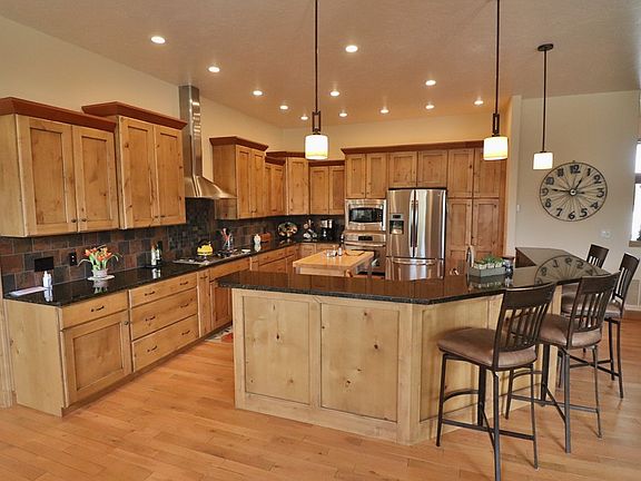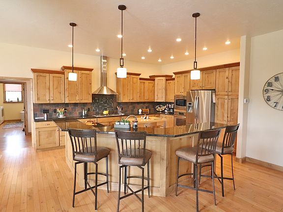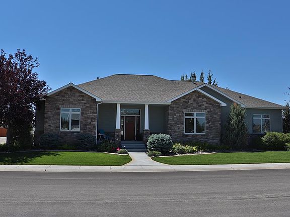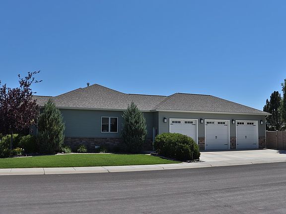 Immaculate ranch style home on an oversized City lot in Powell, Wyoming. This split bedroom floor plan home is custom built and professionally landscaped with no details missed. The great room offers 10 foot crown molded ceilings and a sculpted rock fire place with a gas insert as the centerpiece. The kitchen has granite counter tops, custom alder cabinets, a gas stove top and stainless GE appliances, kitchen island with elevated bar top and more. The are hardwood floors, Pella windows and 36 inch wide doors throughout. The oversized master bedroom is complete with French doors leading to a covered patio, a large master bathroom with double vanities and granite counter tops, a walk-in tile shower with multiple shower heads and a sizeable walk-in closet. In addition, there are 2 guest bedrooms, a full guest bathroom, extra hallway custom closet space, large laundry area and a separate room for an office. The 3 car attached garage is finished and heated with high ceilings, floor drains and offers separate bays for easy parking along with an inside/outside dog kennel. Outside you'll enjoy the privacy fencing, mature landscaping, outdoor kitchen, natural gas fire pit, tool/storage shed with 2 doors along with RV parking. The home offers TCT West fiber optic internet and TV modems along with all city services. Please call the office for additional details or look in documents for a list of numerous hand-crafted touches.