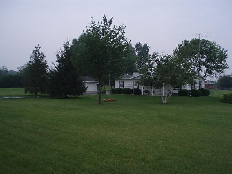 4 acres on corner of two paved raods. Large ranch with central air and natural gas. Fireplace in living room. Great out buildings!