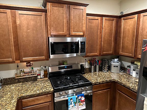 Amazing one story home nestled in the beautiful community of Sierra Ranch on a corner lot! This home features an open floorplan with the beautiful kitchen opening into the living room. The kitchen boasts brand new stainless appliances, stainless steel sink, 36'' staggered upgraded stained Maple Cabinets in a rich Nutmeg color w/ crown molding, and a built in microwave! Ceramic tile flooring in all the right places with neutral upgraded carpet & 9ft ceilings. Spacious lot large enough for a pool, the backyard is fully walled with a HOT TUB on the covered porch! New carpet will be put in mid to end of January.