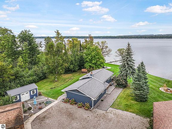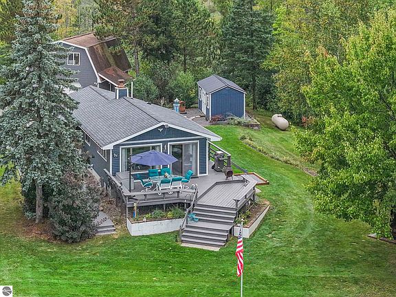 A Green Lake Paradise awaits. Enjoy quiet mornings and evenings on your large deck with spectacular views of the lake and surrounding natural beauty. This completely updated 3 bedroom (including the space above garage), 2.5 bath home sits on approximately 7 acres, with 166' of frontage. The property also boasts a separate "workout" shed, and a 24' by 32' carriage house garage with two overhead doors and a huge finished bonus room above. The large waterfront lawn is level to the water's edge with a beautiful stamped concrete fire pit, where you hear nothing but nature, as the property is set well off the road on a private drive. Located on one of the most expansive parts of the lake, the views truly are gorgeous. If you want to change your vantage point, hop on a boat, and enjoy a peaceful boat ride to take in a concert waterside at Interlochen Center for the Arts. Life really doesn't get much better than this.