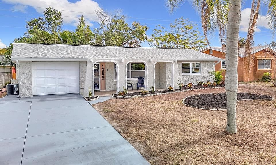 Charming and completely remodeled! Come tour this move-in ready 2 bedroom, 2 bath, 1 car garage home with bonus room and enclosed porch. Step inside, and you will be welcomed into a spacious and very bright living room that is perfect for entertaining family and friends. This home boasts great curb appeal on a quiet, private and peaceful lot. Adding to the appeal is a completely fenced in yard. The home features a bright living space with new vinyl windows throughout. As you enter the home you are greeted by tile and luxury vinyl flooring, 6" baseboards, new doors, and contemporary lighting fixtures/hardware. As you enter the kitchen space you will notice brand new shaker cabinets, new stainless appliances, stunning quartz countertops, custom backsplash and matching fixtures/hardware. You will also notice a fully enclosed and ducted rear tiled porch and great size bonus room. Moving on you will find two luxury custom bathrooms which are both breathtaking! You will find luxury custom tile on the floors and shower enclosure, shiplap walls, a beautiful lighted mirror, floating shelves and all new fixtures. These are bathrooms which you must see to appreciate. Both bedrooms are newly carpeted and have great size closets. Lastly you will find a freshly painted garage, with washer/dryer hookups. Brand new roof 2024. Water heater 2019. A/C in great condition and a recently updated electric panel. New vinyl windows. Appliances 2025. Exterior paint 2025. New gutters 2025. This home is NOT located in a flood zone. No flood insurance required. No HOA! Enjoy all that Port Richey and Tampa Bay has to offer! Only minutes from downtown New Port Richey offering multiple restaurants, breweries, and shops. Close to airports, beaches, parks, river, theme parks, and other attractions. Schedule a showing today. This one won't last!