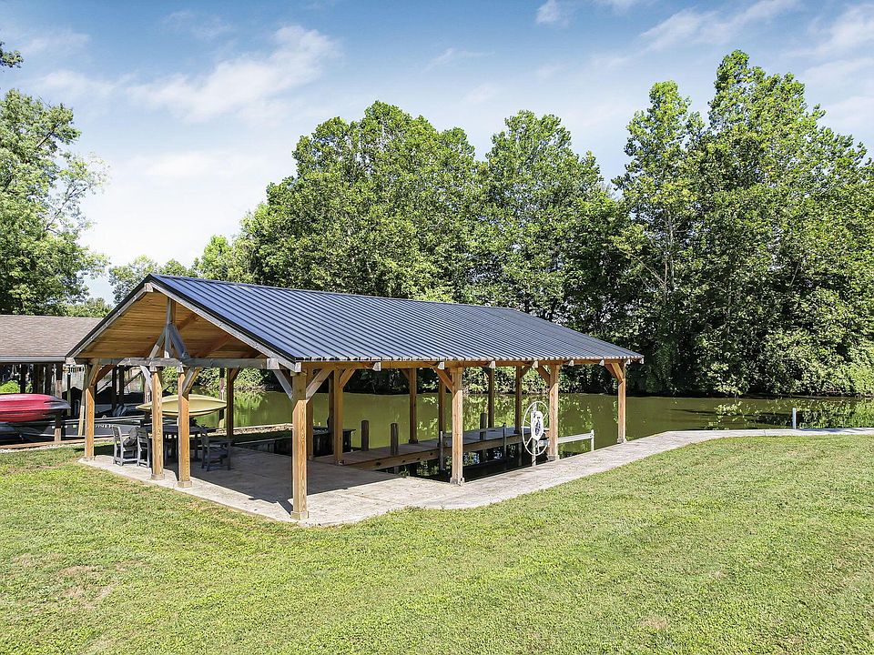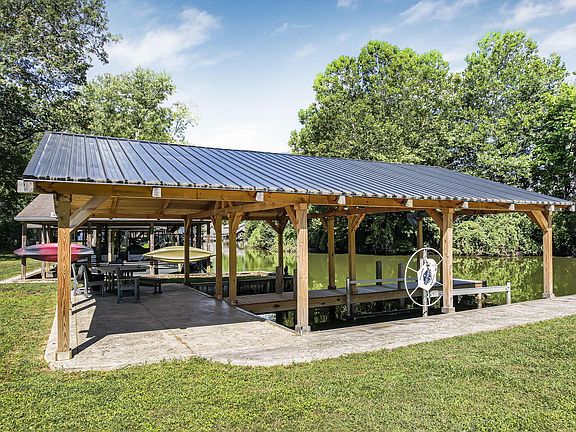 Enjoy lakeside sunsets from your new covered boat docks and patio, complete with a boat lift and jet ski docks that convey. An 18x24 detached garage provides ample space for lake toys or storage, making this the ultimate setup for water lovers.